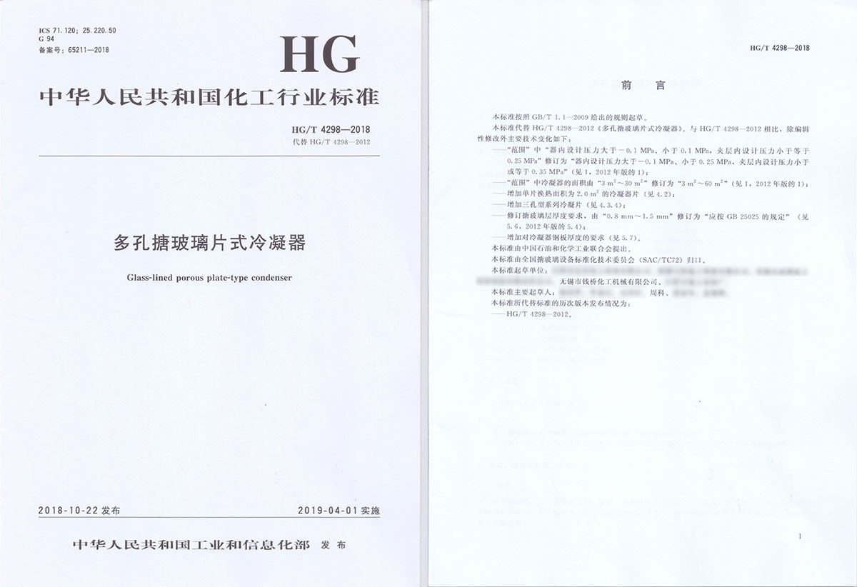 無錫錢橋化工機(jī)械有限公司參與起草中華人民共和國化工行業(yè)標(biāo)準(zhǔn)HG/T 4298-2018《多孔搪玻璃片式冷凝器》。