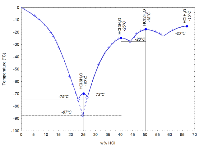 如下圖所示,鹽酸共有四個結(jié)晶的共熔點,分別對應(yīng)四種晶體:68%(HCl的質(zhì)量分數(shù),下同)時的HCl·H2O、51%時的HCl·2H2O、41%時的HCl·3H2O和25%時的HCl·6H2O。另外在24.8%時還有一種亞穩(wěn)的HCl·3H2O生成。
