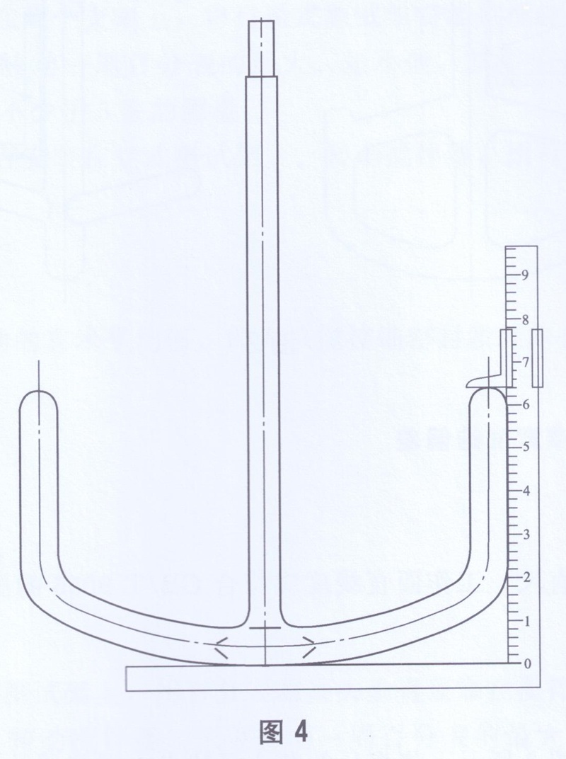 將待測攪拌器放平,如圖4所示,將直角尺的長邊和短邊緊貼在攪拌器錨翼上,移動(dòng)滑塊到攪拌器錨翼端點(diǎn),在長邊上讀出攪拌器錨翼的高度,取攪拌器兩個(gè)錨翼的高度平均值與標(biāo)準(zhǔn)高度之差的絕對(duì)值作為攪拌器錨翼高度與標(biāo)準(zhǔn)高度的偏差。