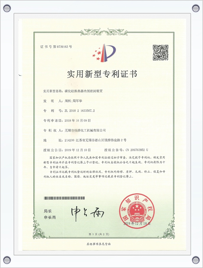 碳化硅換熱器內(nèi)測(cè)密封裝置專利證書