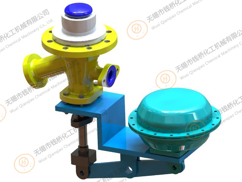 Bottom outlet valve (65°) gap free with pneumatic actuator.搪玻璃上展式自動(dòng)放料閥 *內(nèi)置測(cè)溫氣動(dòng)放料閥Can not be used for liquids containing fluoride ions (such as hydrofluoric acid, etc.), nor can it be used for strong alkalis and concentrated phosphoric acid with a temperat
