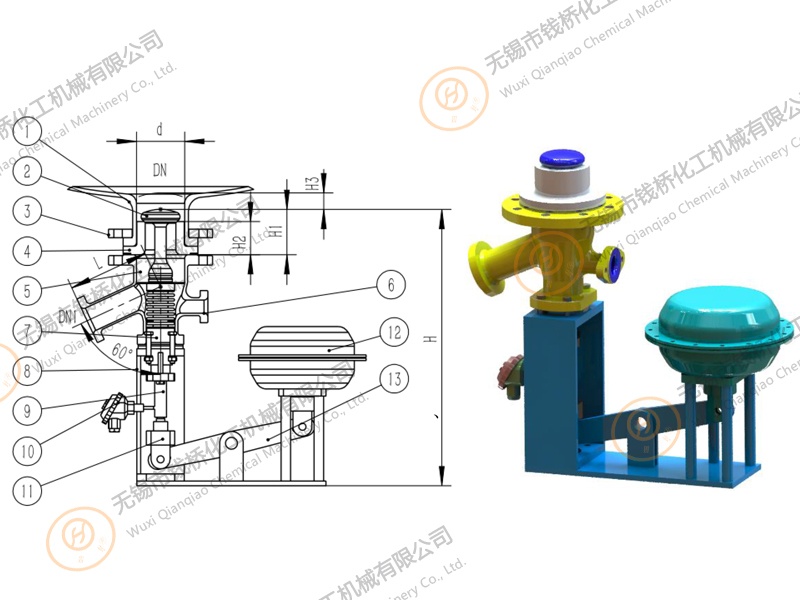 Bottom outlet valve (60°) gap free with pneumatic actuator(Side cylinder)搪玻璃上展式自動放料閥(側向執(zhí)行機構) *內置測溫氣動放料閥.The inorganic acid, organic acid, weak alkali solution and organic solvent are superior to stainless steel in strong corrosive media such as hydrochlor